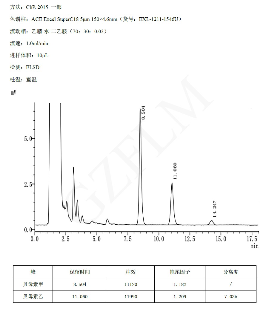 ACE SuperC18色譜柱由于其獨特的封裝鍵合技術(shù),顯著增加了硅膠表面的配體覆蓋率,并有效消除了分離中的未鍵合硅醇基的影響。當在分析堿性分子時,這種超惰性的色譜柱可以提供優(yōu)異的峰形和柱效。下圖分別為浙貝母中貝母素甲和貝母素乙的測定、通絡(luò)骨質(zhì)寧膏中青藤堿的測定。
