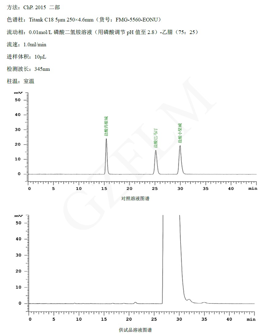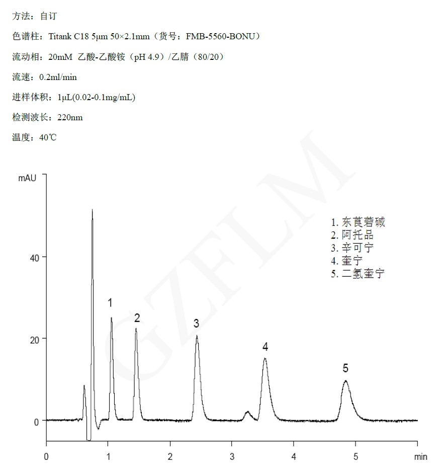 Titank C18有機硅膠雜化色譜柱,是在硅膠的硅氧網(wǎng)狀構(gòu)造中以更加穩(wěn)定的烷基來取代在堿性條件下不穩(wěn)定的硅氧橋連接,具有寬pH耐受范圍(1-12)、低背壓和100%水相穩(wěn)定的特點,對于較大極性的物質(zhì)有很好的保留。下圖分別為幾種生物堿的分析、鹽酸小檗堿的有關(guān)物質(zhì)。