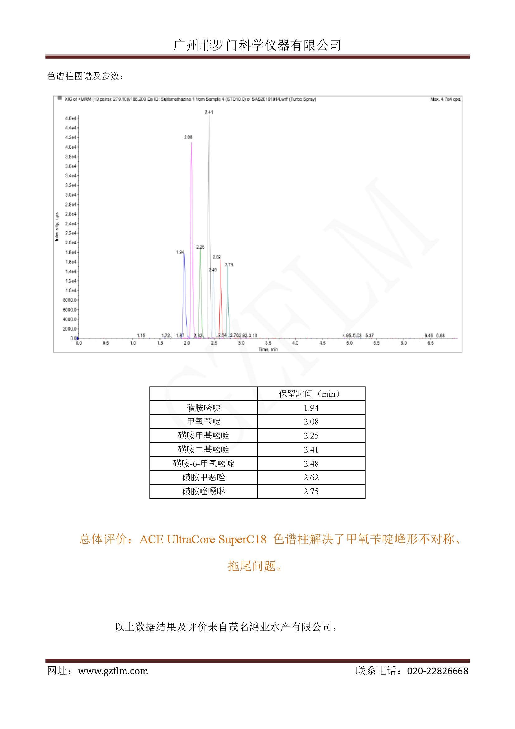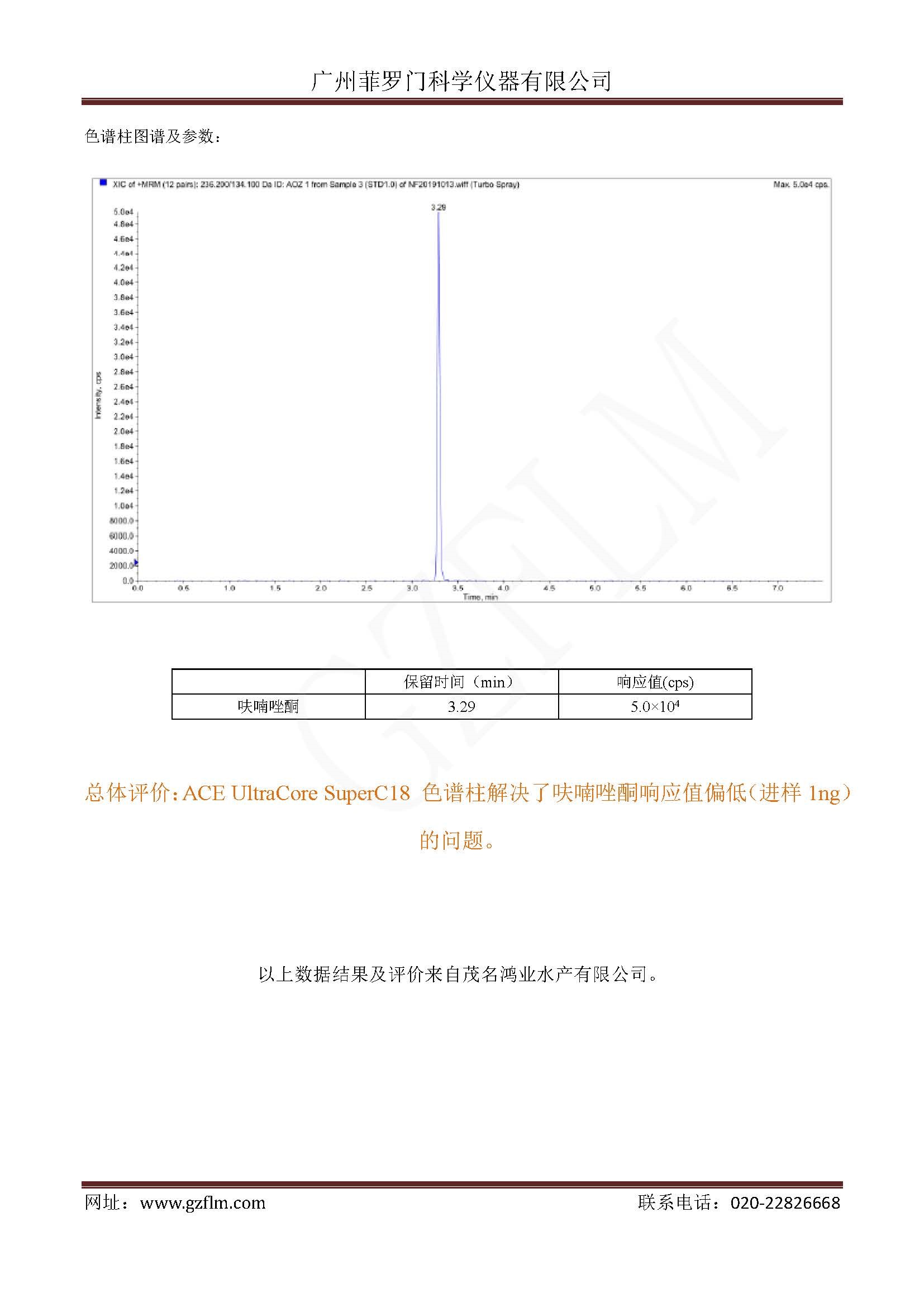 以上由ACE UltraCore Super C18 2.5u 50 X 3.0mm (貨號:CORE-25A-0503U)一根柱子在質譜上解決硝基呋喃類、氯霉素類、磺胺類、沙星類、孔雀石綠和結晶紫水產品中的藥物殘留。