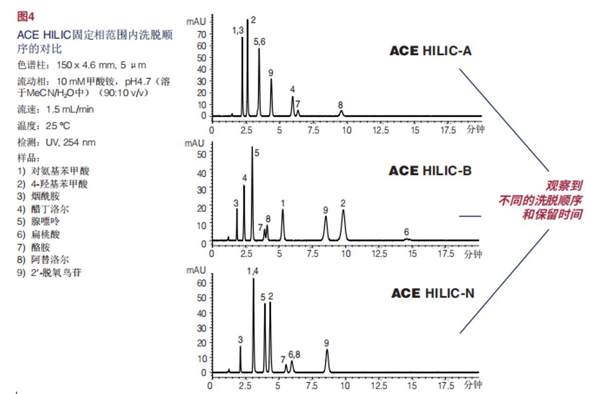 *中性ACE HILIC-N相對陰陽離子都顯示出較低的離子交換能力,保留機(jī)制包括極性相互作用、吸附和一定的分散作用。