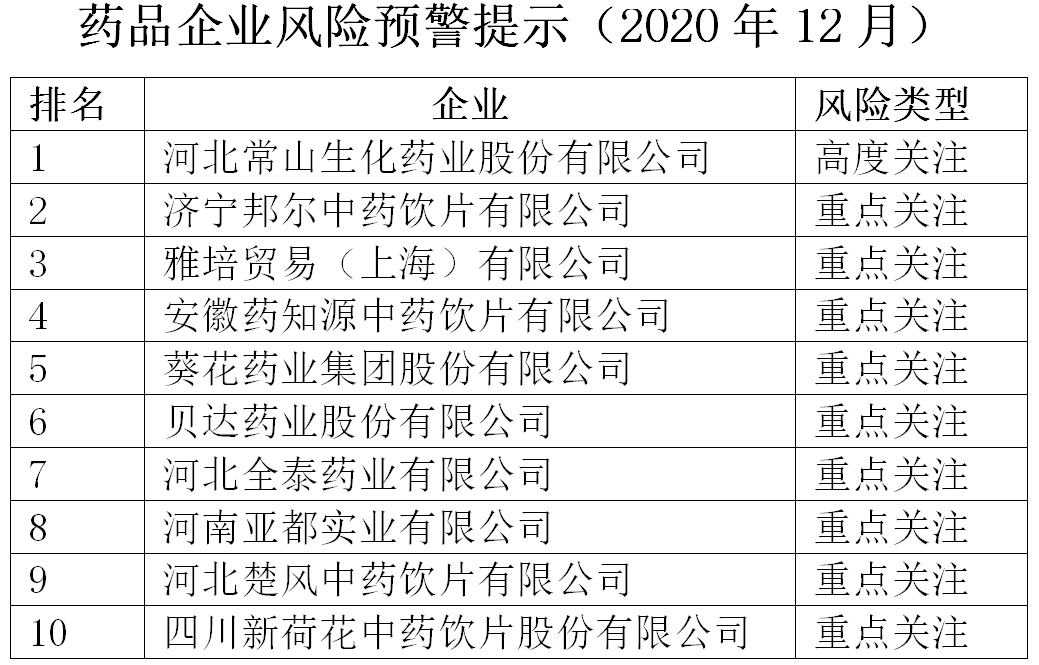 近日,中國健康傳媒集團(tuán)輿情監(jiān)測中心發(fā)布藥品企業(yè)風(fēng)險預(yù)警提示(2020年12月),公開風(fēng)險指數(shù)排名前十的企業(yè)。河北常山生化藥業(yè)股份有限公司(以下簡稱常山藥業(yè))排名第一,為“高度關(guān)注企業(yè)”;濟(jì)寧邦爾中藥飲片有限公司、雅培貿(mào)易(上海)有限公司、安徽藥知源中藥飲片有限公司、葵花藥業(yè)集團(tuán)股份有限公司、貝達(dá)藥業(yè)股份有限公司、河北全泰藥業(yè)有限公司、河南亞都實(shí)業(yè)有限公司、河北楚風(fēng)中藥飲片有限公司、四川新荷花中藥飲片股份有限公司分列第2至10位,為“重點(diǎn)關(guān)注企業(yè)”。
