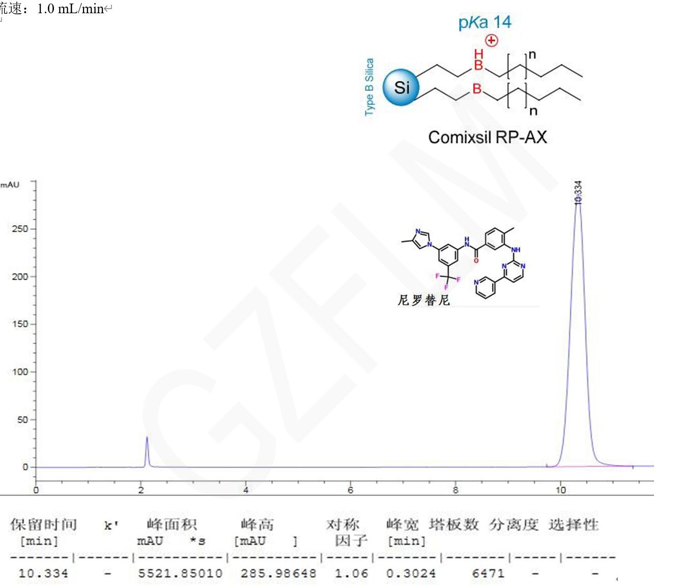 方法說(shuō)明:尼羅替尼具有多個(gè)堿性基團(tuán),在 C18 柱上會(huì)出現(xiàn)明顯拖尾效應(yīng);而使用 Comixsil RP-AX 是陰離子交換+疏水混合模式,對(duì)化合物上堿性基團(tuán)是排斥作用,可以達(dá)到改善峰型的效果。