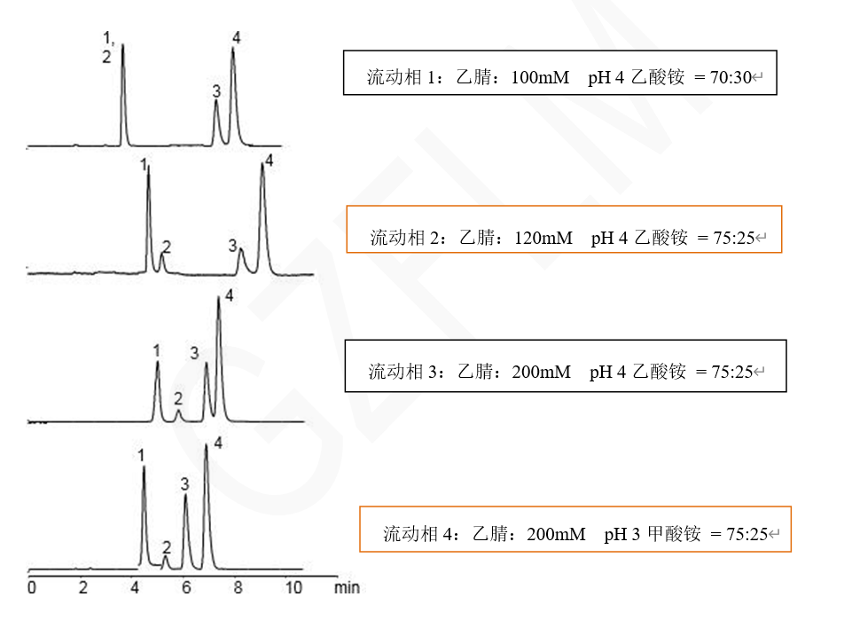說明:本案例中乙腈比例及緩沖鹽種類和強度的變化帶來磷霉素與庶糖的0分離到完全分離的變化, 以及保留時間上的變化。類似的雜質也可通過此類調整或者梯度調整條件,實現分離。 在液相中同時分析磷霉素、蔗糖、氨丁三醇及鈉離子是一個復雜的過程,因為這四種物質在化學性質、極性和保留行為上可能存在顯著差異。以下是一種可能的分析策略: