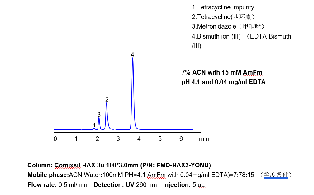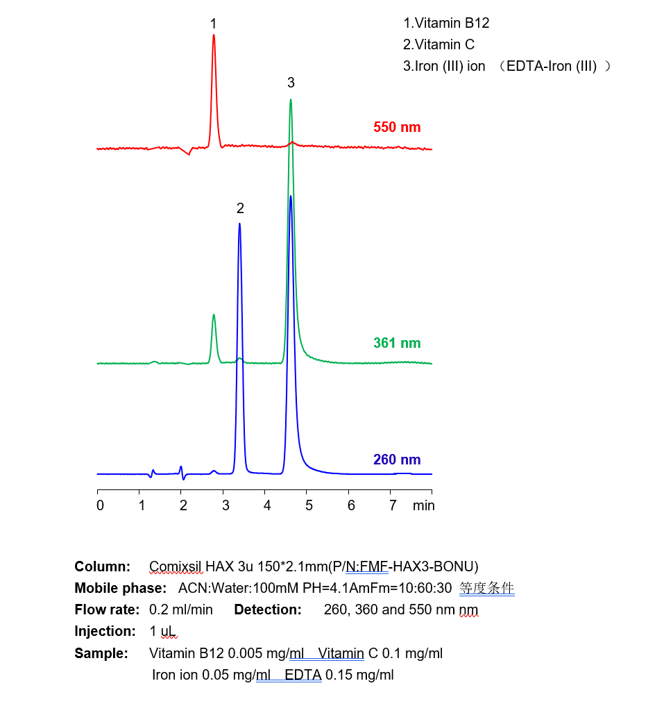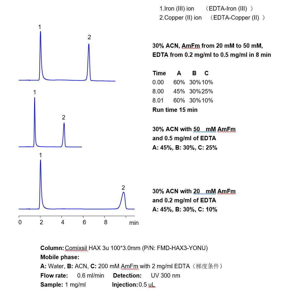 三價鐵離子等三價金屬離子,在硅膠基質(zhì)的色譜柱中極易死吸附,從而損壞色譜柱,在液相直接檢測中存在較大難度。 本方法研究三價鐵離子與EDTA形成紫外可見的強吸收絡合物,再通過Comixsil HAX色譜柱保留。通過對絡合物的定量從而定量三價鐵離子等三價金屬離子。 應用一:三價鐵離子的檢測 方法A、三價鐵離子流動相中與EDTA絡合