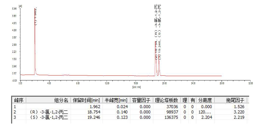 說明: 采用FBX-DEX DET Beta 30m*0.25mm*0.25um 手性氣相柱,可以成分分離(S)-3-氯-1,2-丙二醇和(R)-3 氯-1,2-丙二醇,分離度良好。而后出峰的(S)-3-氯-1,2-丙二醇,如果作為0.1%檢出限的考察,也完全分 離。 如需更大分離度,也可自行考慮FBX-DEX DET Beta 60m×0.25mm×0.25μm 手性氣相柱。 |