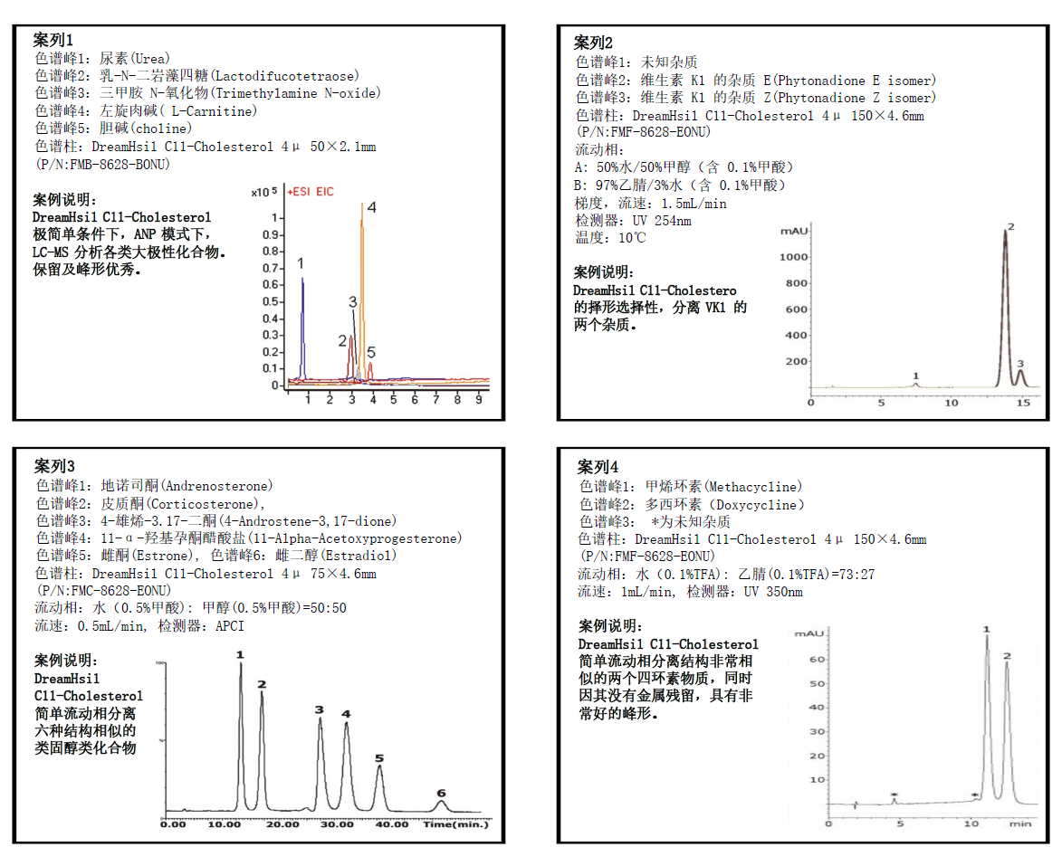 - DreamHsil C11-Cholesterol 色譜柱 C11-Cholesterol具有非常獨特的選擇性。采用獨特鍵合技術,將固定相直接獨立的單點鍵合于Si-H鍵上直接形成Si-C鍵的C11-Cholesterol鍵合相。