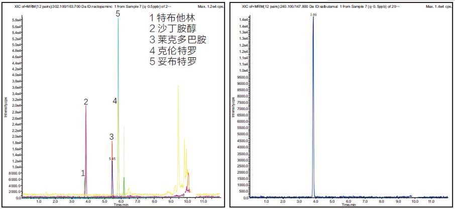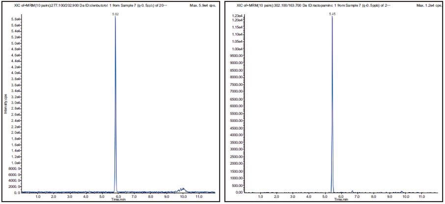 2、添加水平為 0.5μg/kg 豬肉基質中β-受體激動劑檢測色譜圖